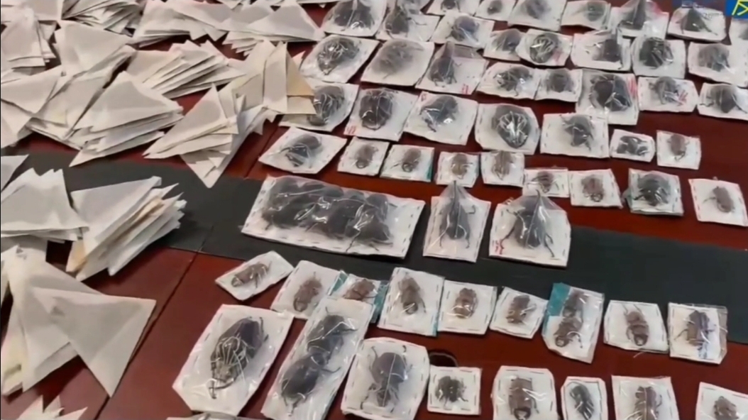 據海關發布通報指,廣州海關所屬廣州白雲機場海關關員近日在對一架進境航班進行監管時,發現一名旅客攜帶的行李機檢圖像異常。經進一步查驗,現場關員發現該旅客的行李箱內有大量三角形的紙質包裝袋,袋內均裝有蝴蝶標本,標本色澤艷麗,長約7至8厘米,共計1601個。行李箱內還有用塑料膜封裝的甲蟲標本,共計93個。經送技術機構鑒定,確認該批蝴蝶標本品種為藍閃蝶、淡綠無螯蛺蝶和鳳蝶;甲蟲標本品種為大王花金龜、霍爾曼花金龜、神馬大兜蟲、螃蟹鍬甲、非洲鉗角鋸鍬和塞內加爾鋸鍬。