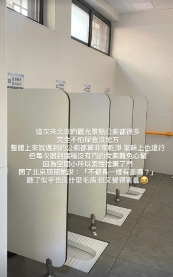 徐瑋吟在綜藝節目任助理而成名,憑美貌及了才而當紅,還當起主持人。近日她趁假期前往北京旅遊。上周日(1日)她在Instagram上傳圖片,圖片可見三個蹲式馬桶,還有四片大約一個人高的隔板隔開每個馬桶,但廁所沒有門。她說:「這次來北京的觀光景點公廁都很多,完全不怕尿急沒地方。整體上來說遇到的公廁都算非常乾淨,氣味上也還行,但每次遇到這種沒有門的女廁難免心驚。因為空間小,所以索性捨棄了門,問了北京朋朋她說: 『不都長一樣有差嗎』?聽了似乎也沒甚麼毛病,但又覺得害羞。」有網民取笑:「唯一的好處應該不用敲門吧…呵呵」。