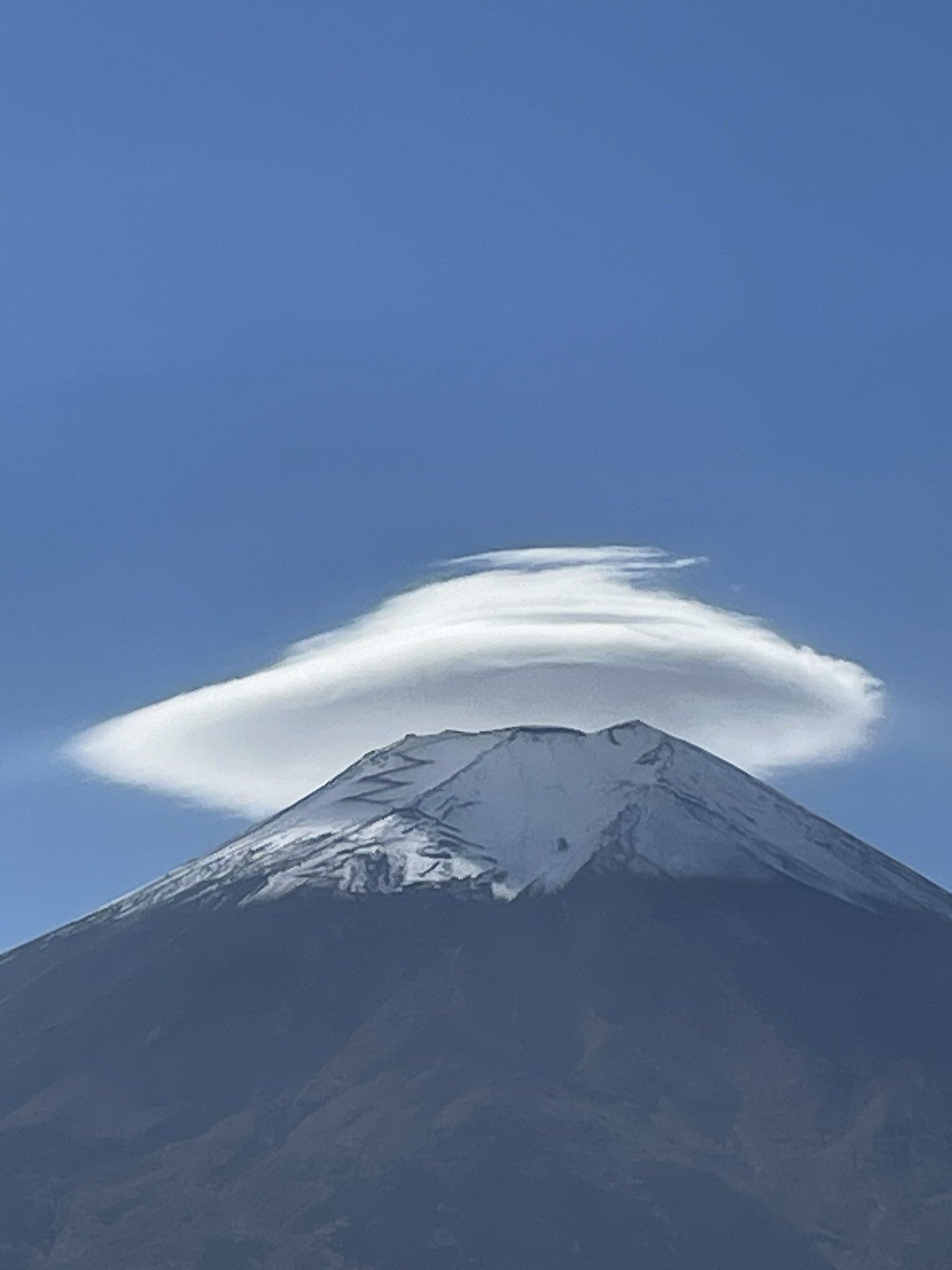 今個月20日的早上,富士山的上方,出現了一片橢圓形的厚實雲層蓋在山頂上,在萬里無雲的天氣下,富士山猶如戴上了一頂純白的斗笠,畫面十分壯觀。