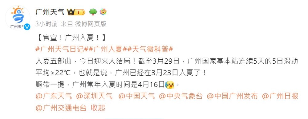 3月30日,廣州市氣象部門宣佈,根據氣候季節劃分標準及近期廣州地區的氣象數據,認定3月23日為2024年廣州在氣候上進入夏季的日期。這意味着廣州迎來1961年以來最早的「氣候入夏日」。![]()