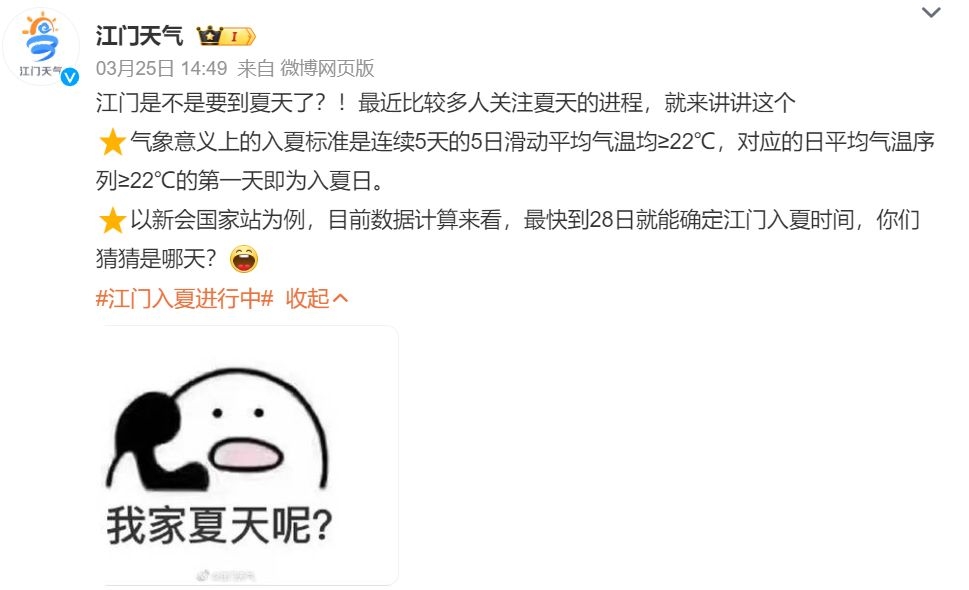 據@江門天氣,江門已於3月22日入夏,較往年(4月9日)偏早18天。